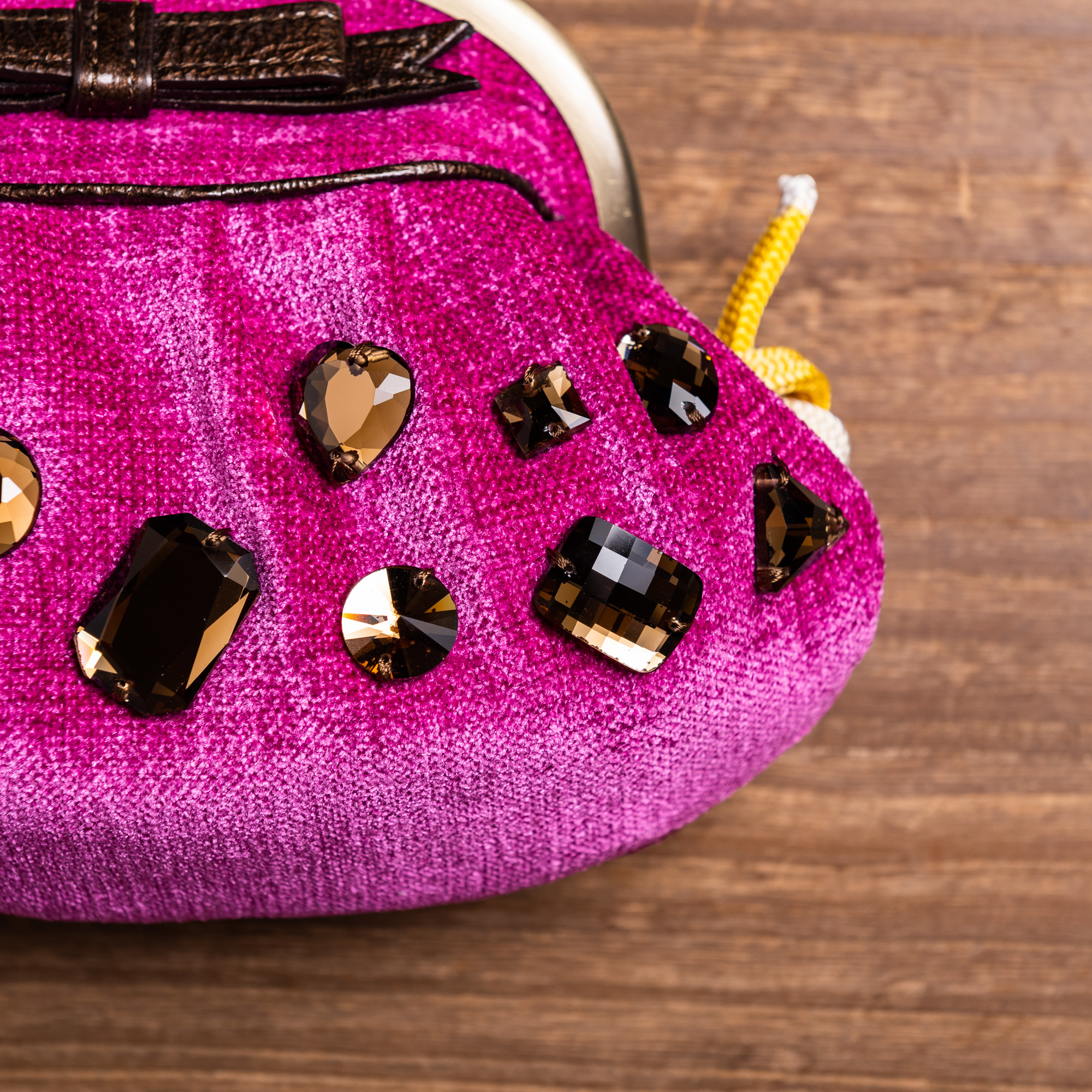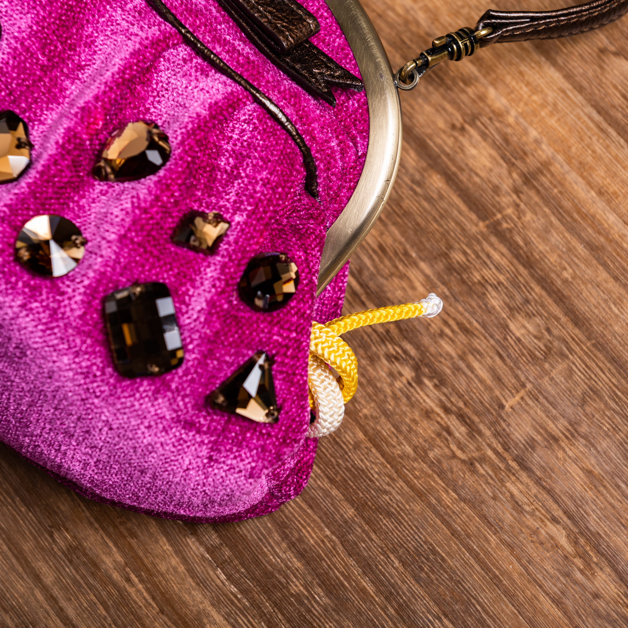 ピンクが強めの紫に、レトロな茶色の宝石ビーズが縫い留められたバッグです。布地のやわらかなイメージに、角ばった宝石がうまくデザインされ、持ち手やバッグのリボンは茶色の革、留め具はアンティークゴールドにすることで、かわいらしいなかにも高級感を感じます。サイドの黄色い組紐が、まとまったデザインをちょっと崩していて、愛嬌のあるチャーミングなバッグです。成人式の振袖や、訪問着のほか、ちょっとしたお出掛けにもお持ちください。