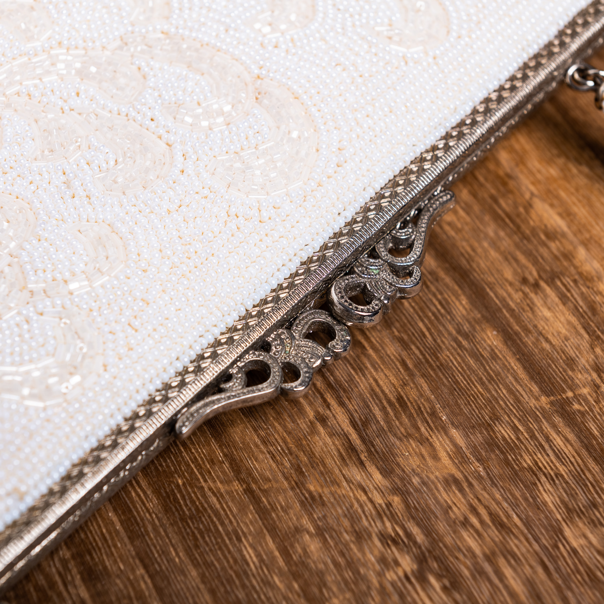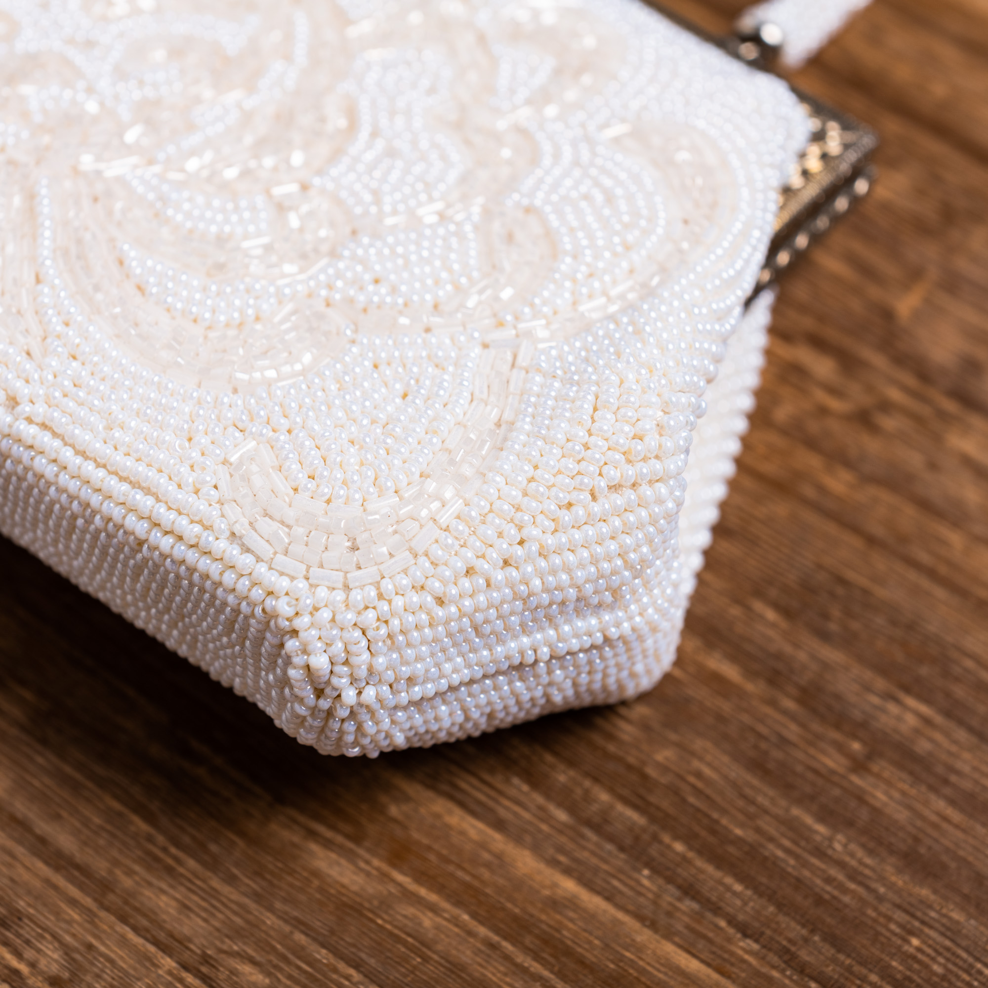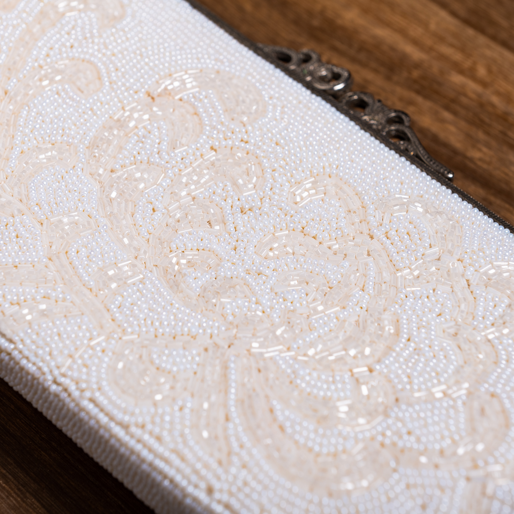 真っ白な丸いビーズと筒状のビーズで菊の花が描き出された、総ビーズのバッグです。白だけですが、華やかな輝きを放つバッグです。持ち手は同じ白の丸いビーズで覆いつくされています。留め具はシルバー色に彫りの上品なデザインです。バッグの口部分の直線的な彫りと、留め具の曲線的な彫りが美しく対比しています。成人式の振袖や、訪問着などのほか、黒留袖や色留袖でもお持ちいただけそうです。