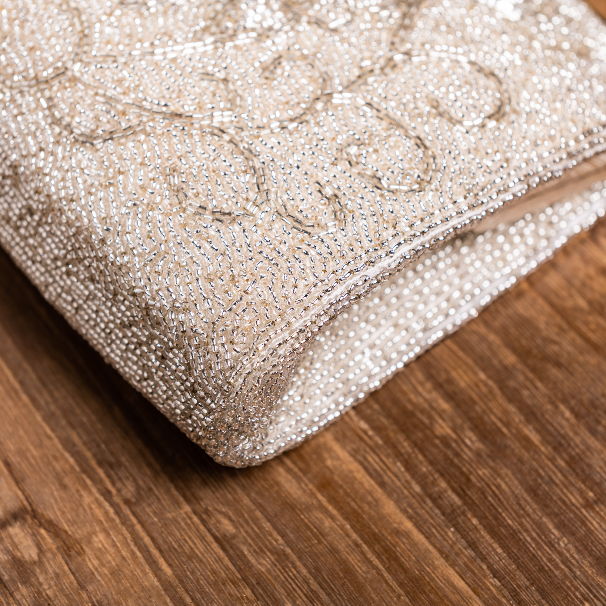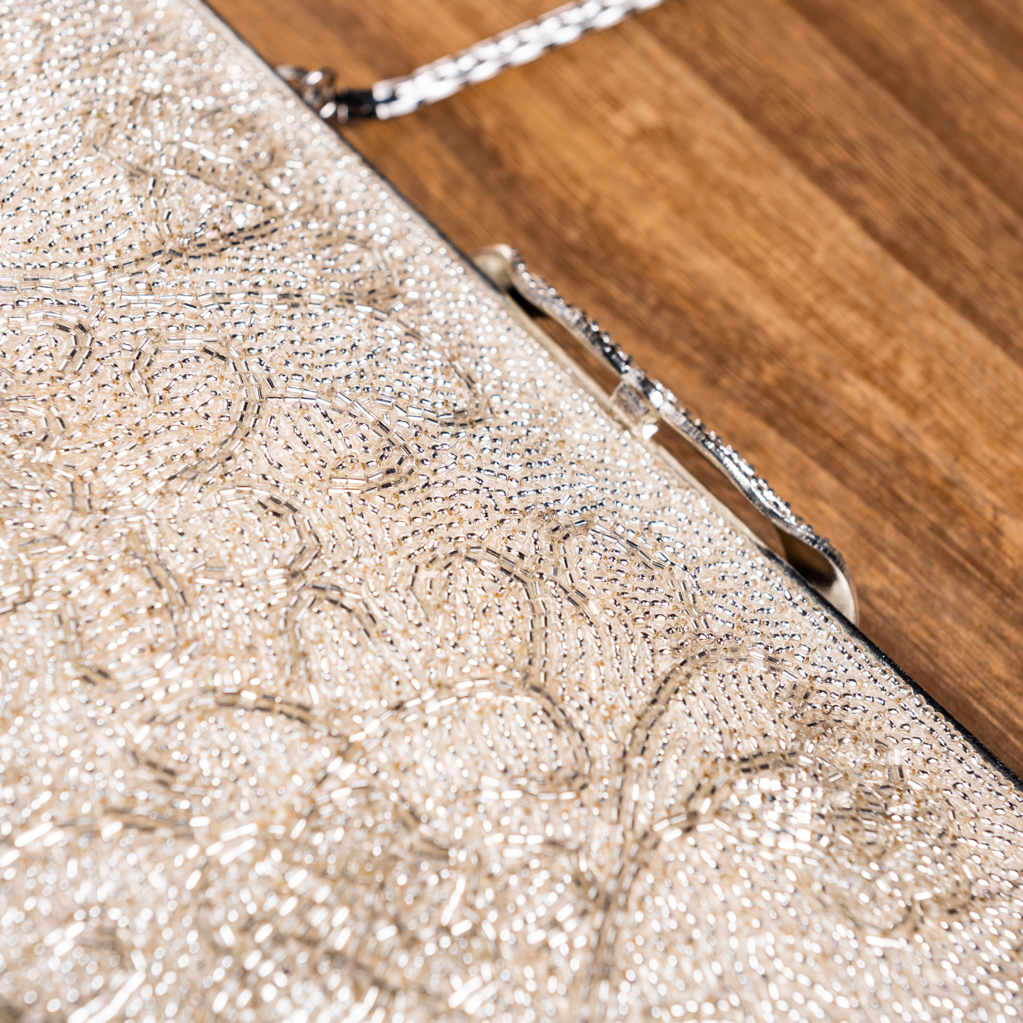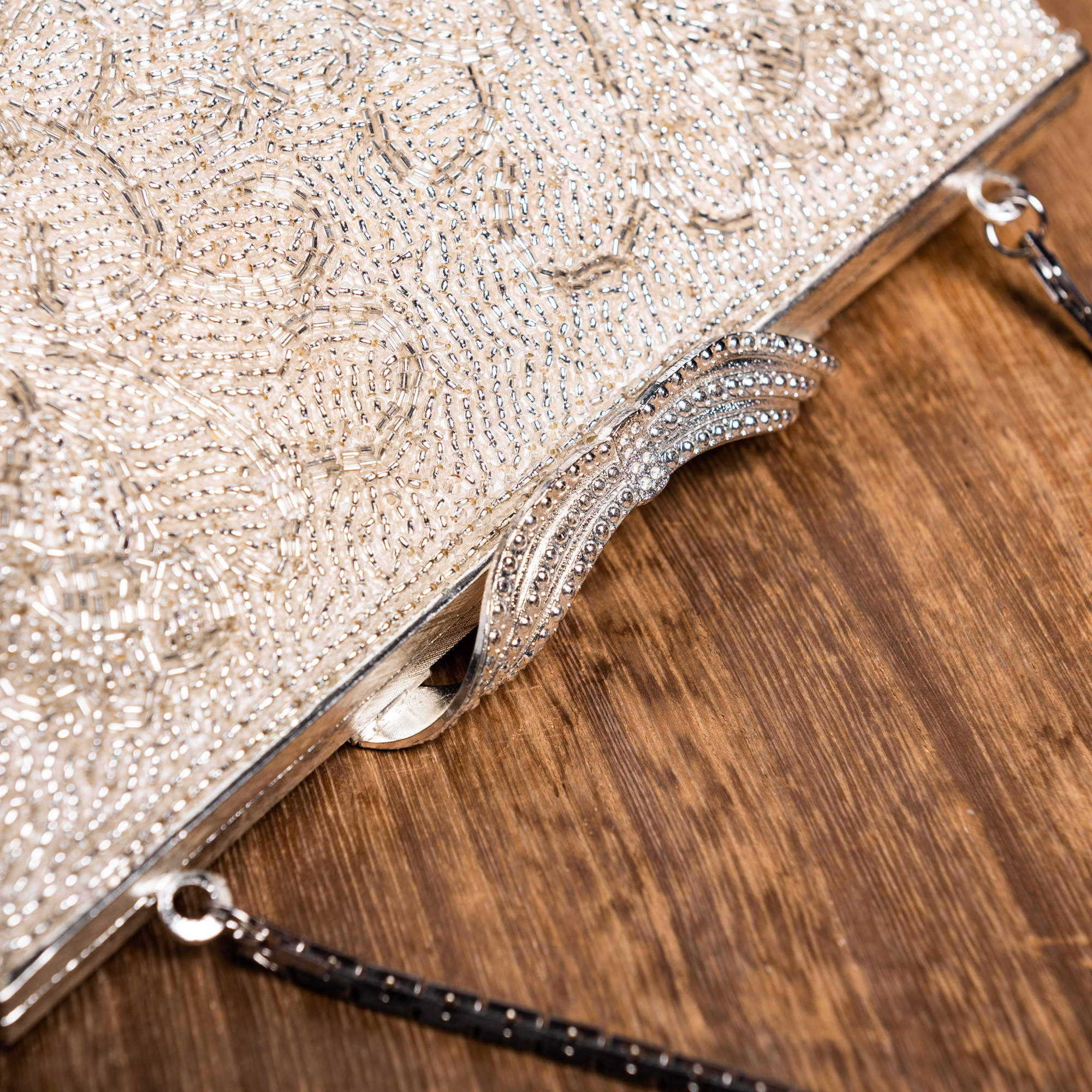 白地にツタ植物がデザインされた、総ビーズのバッグです。チェーンや留め具がシルバー色なので、全体的にもシルバーの輝きに満ちています。角ばったチェーンに対し、波打つような留め具のデザインが絶妙です。留め具の細工は真珠を並べているかのようにも見え、高級感にあふれています。成人式の振袖や、訪問着などでお持ちになってください。留袖や色留袖でも上品にお持ちいただけます。