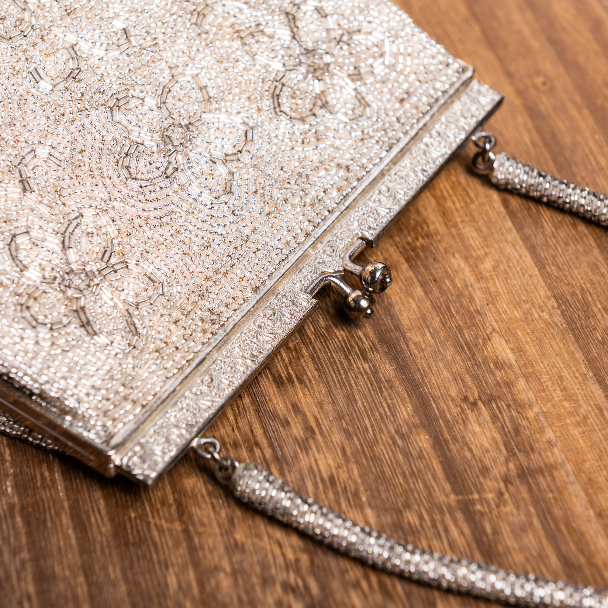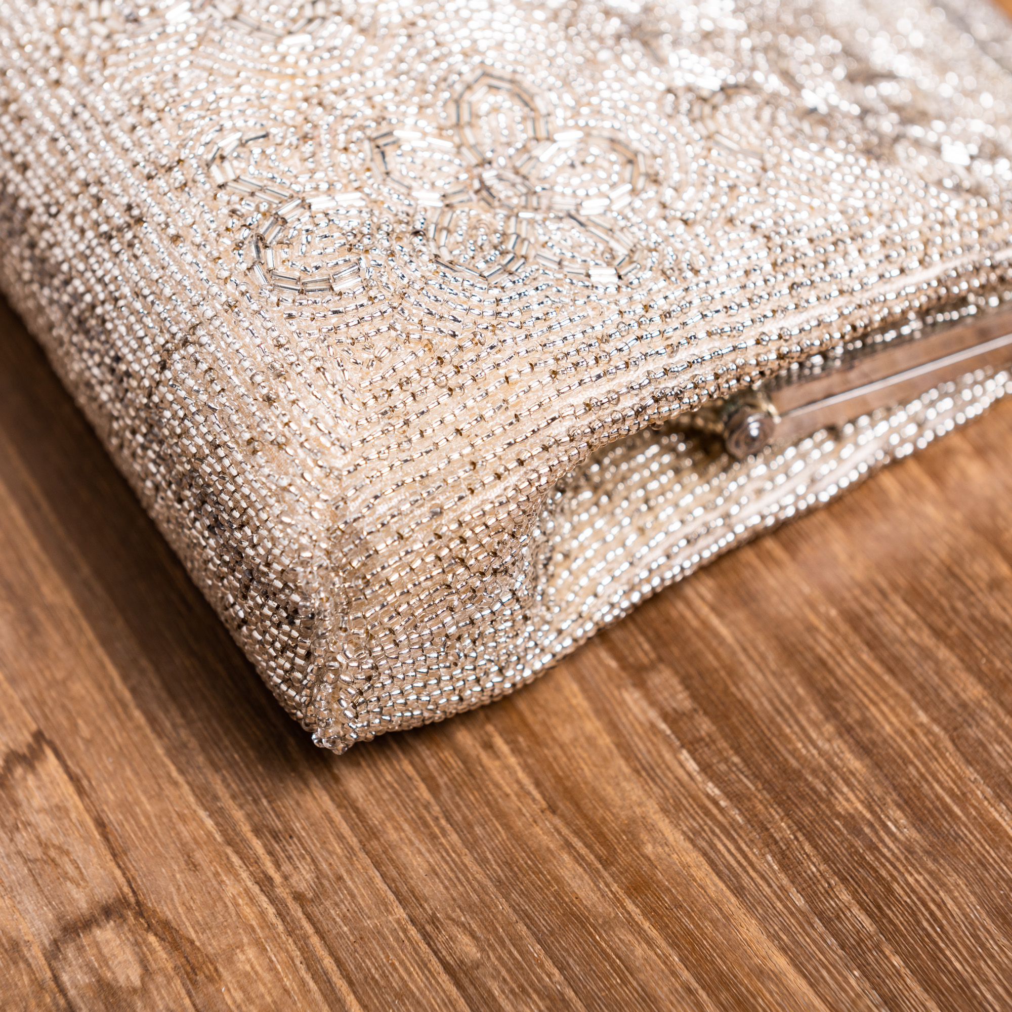 たくさんの小さな五弁の花が描き出された、白銀色に輝く総ビーズのバッグです。描かれたのは梅でしょうか、桜でしょうか。どちらにしましてもお祝いの席にふさわしい、縁起の良い柄となります。持ち手は同じ色の丸ビーズがびっしりと留められ、バッグの口にはたいへん細かい唐草の彫りがほどこしてあります。留め具はシンプルで、くどすぎることなく上品にまとまったバッグです。成人式の振袖や、訪問着、留袖、色留袖などでお持ちになってください。