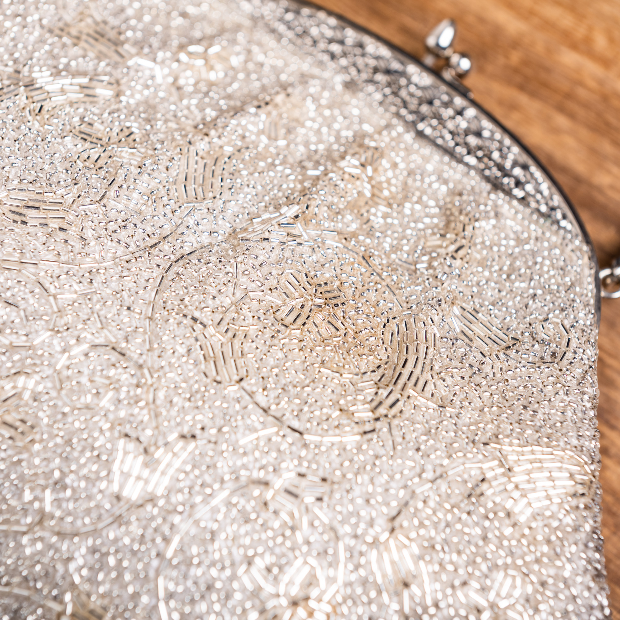 コロンとした丸いフォルムがかわいらしい、総ビーズのバッグです。白い生地に丸や筒状の透明のビーズで、花唐草のようなデザインが描き出されています。数粒ずつのビーズを一度に留めていくという、アンティーク特有の留め方で、それぞれがふんわりと持ち上がり、表面に奥行きのあるバッグです。持ち手も同じ色の丸ビーズです。バッグの口には洋風の花唐草のような透かし彫りがほどこされ、若々しく洗練された印象のバッグです。成人式の振袖や、訪問着などでお持ちになってください。