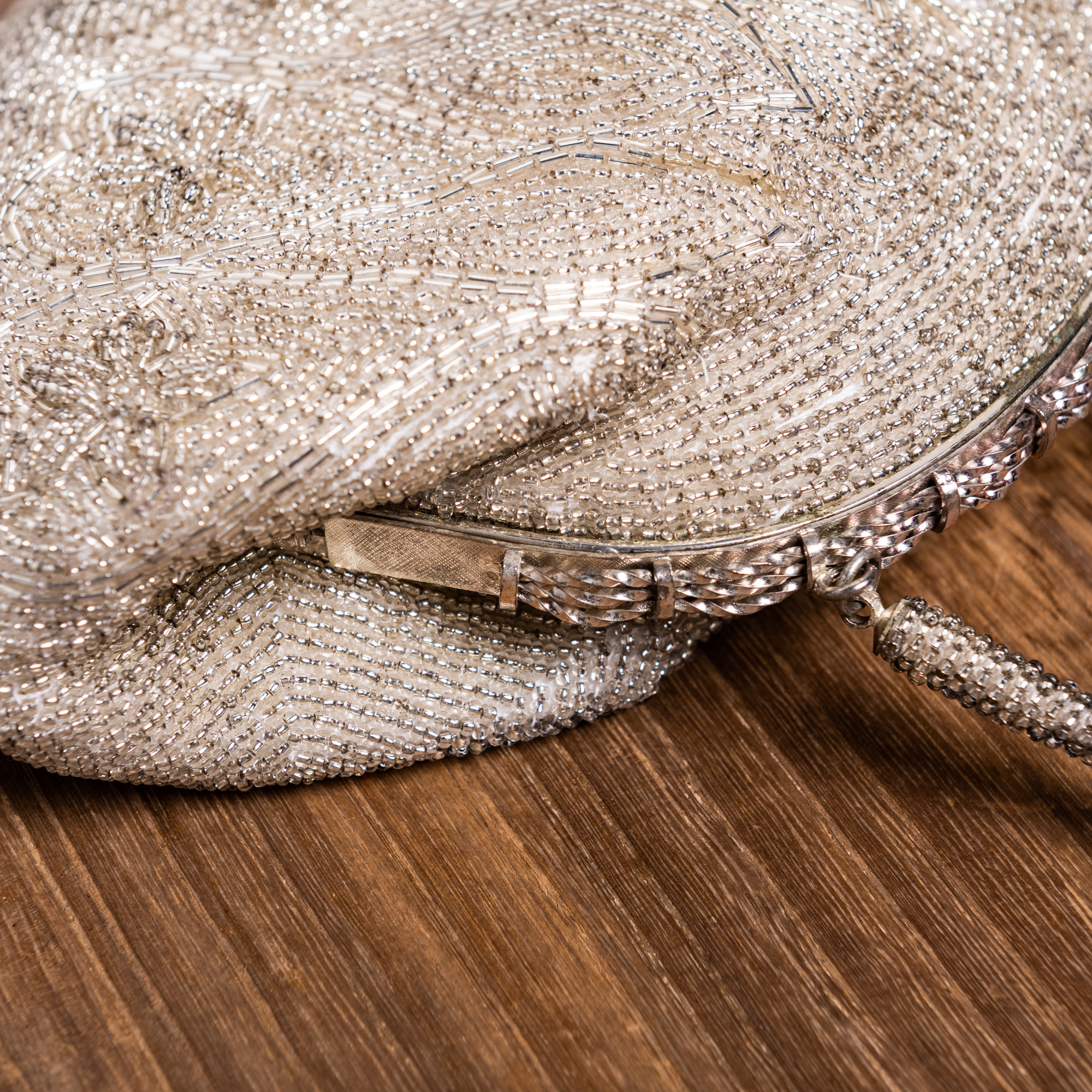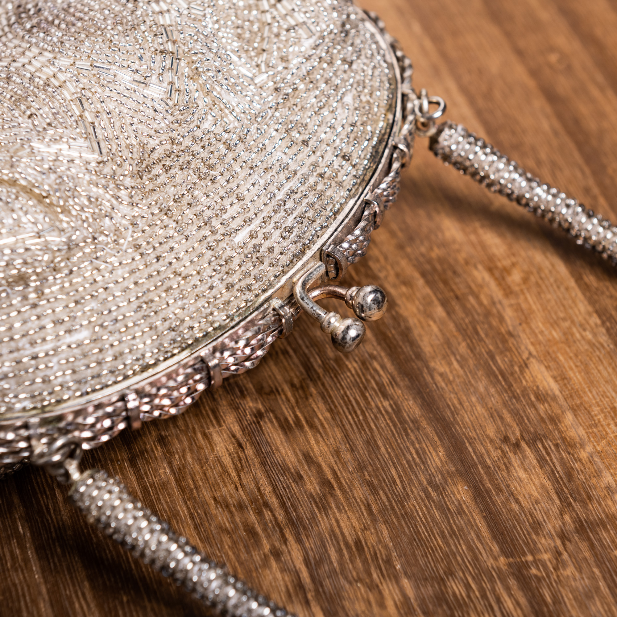 変形した立涌なのか、逆さまのハートなのか、はたまた植物のツルなのか。動きのある線の中に、クレマチスのような五弁の花が描き出された、透明ビーズのバッグです。バッグの上部はビーズが横に連ねられていて、バッグの口や持ち手との一体感が生まれています。ビーズの輝きがアンティークならではで美しいですね。コロンとしたフォルムの上質な総ビーズのバッグは、留袖・振袖・訪問着など、どのような着物でもお持ちいただけます。
