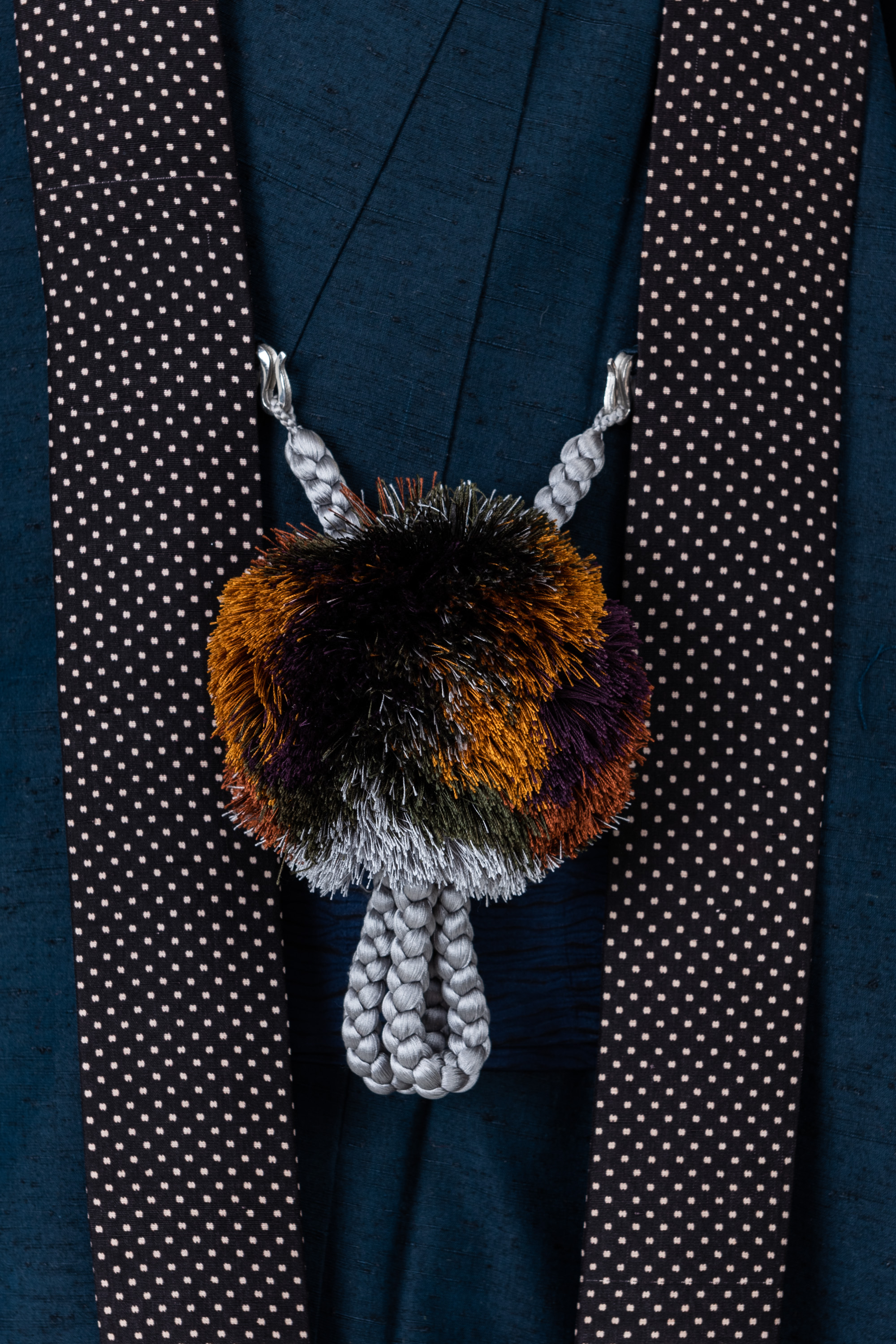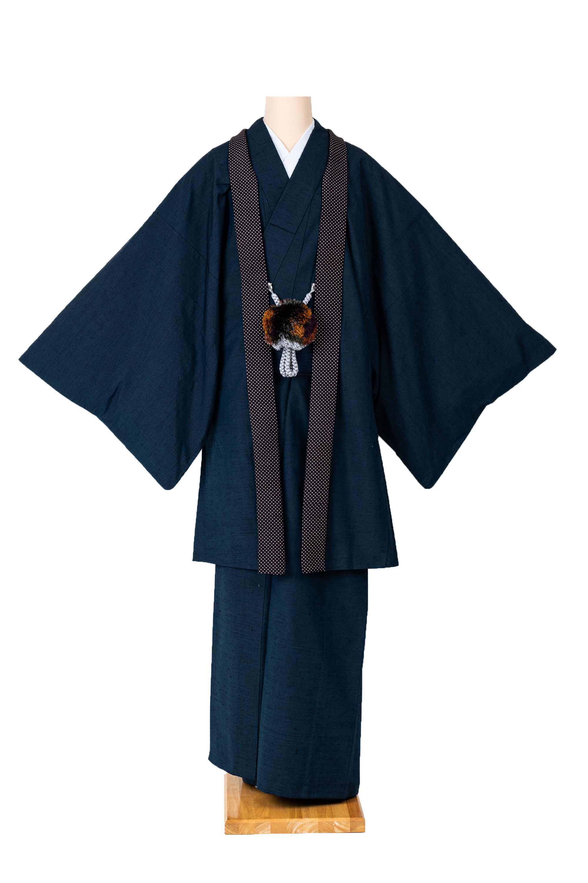 ドット柄衿とフワフワ羽織紐のグリーン系の紺色アンサンブル【men29】