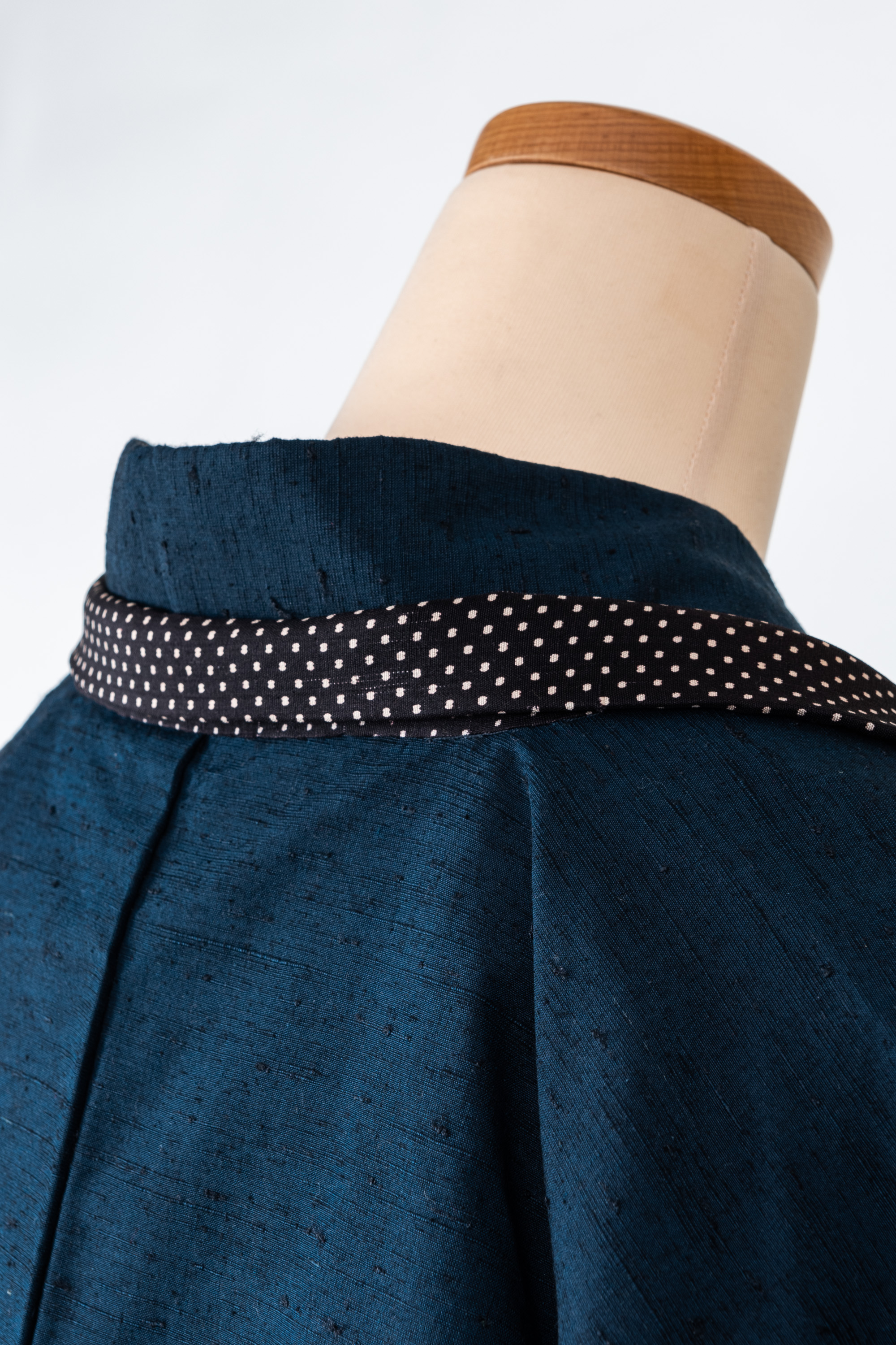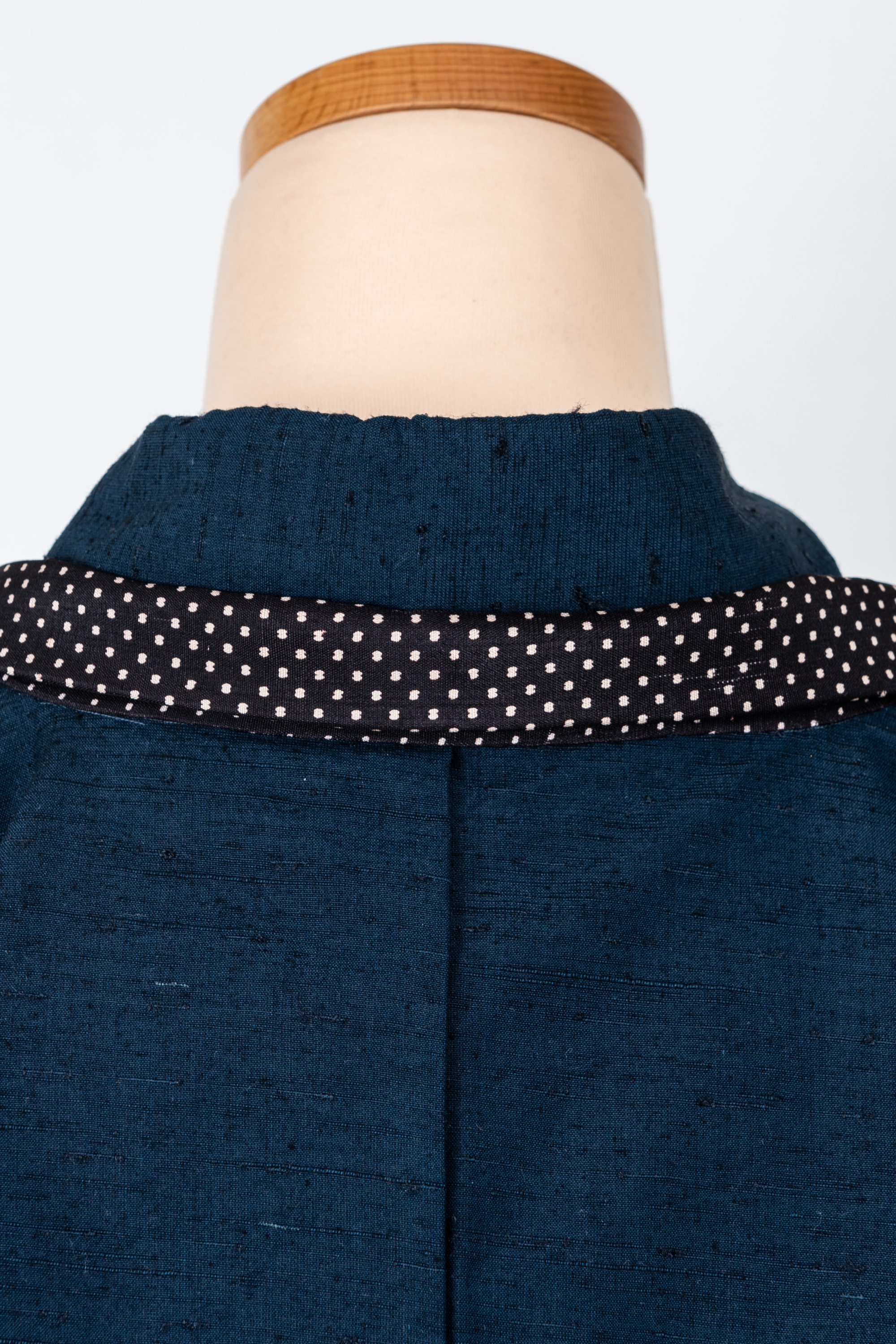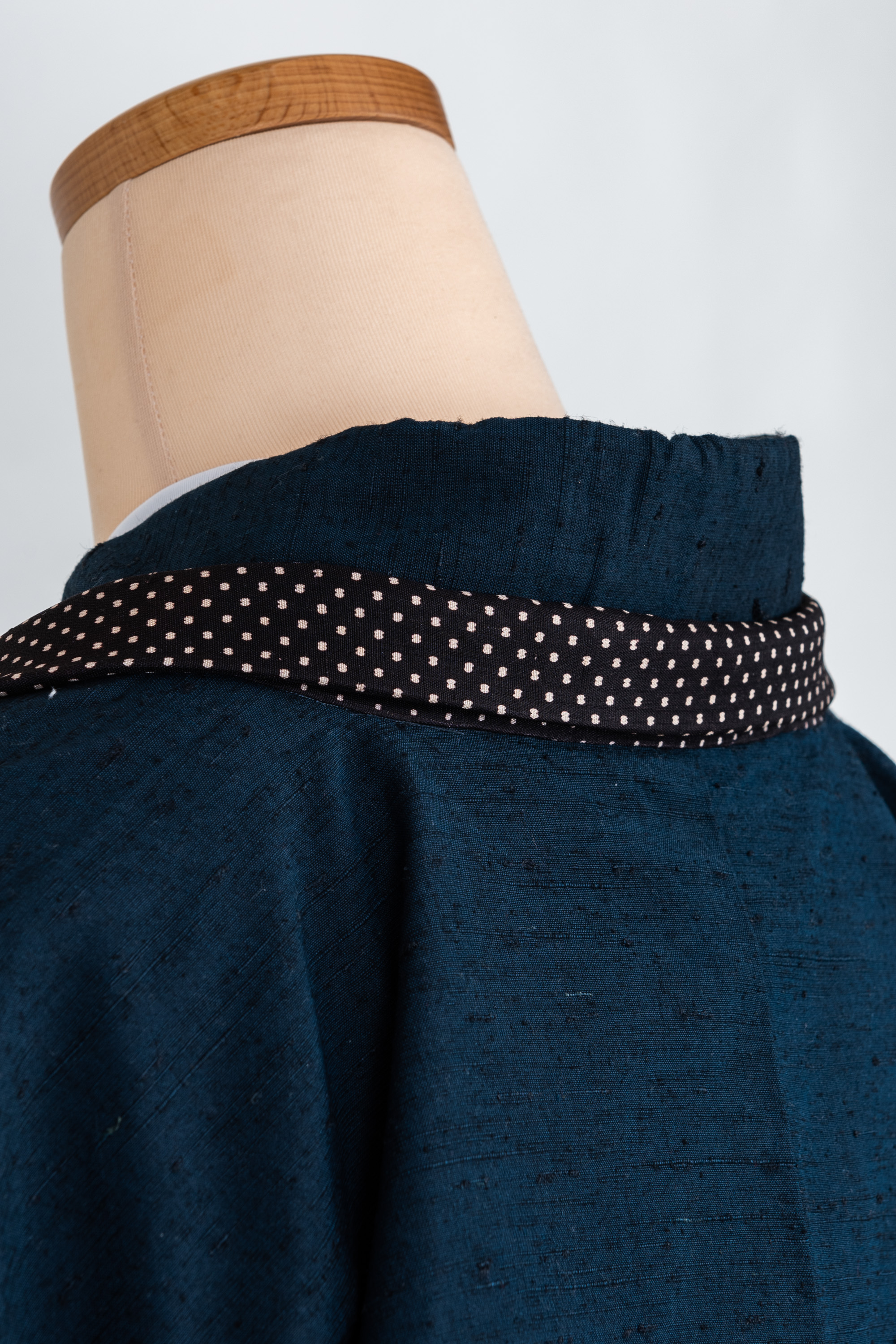 羽織の衿の部分を裄に足して、別の生地を衿に仕立てたのですよ。しかも水玉模様。ゆめやの和裁士は凄腕のうえにお茶目です。