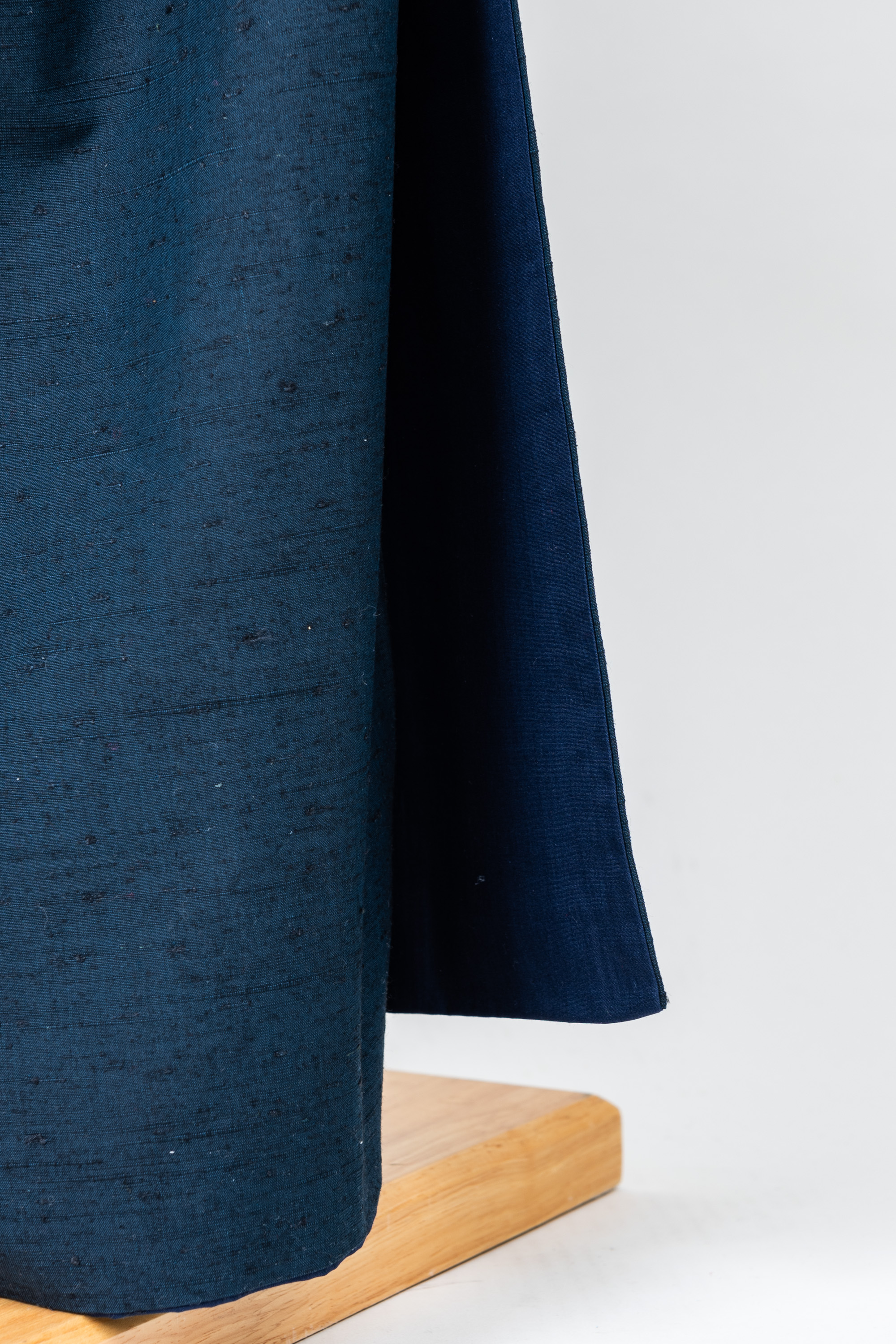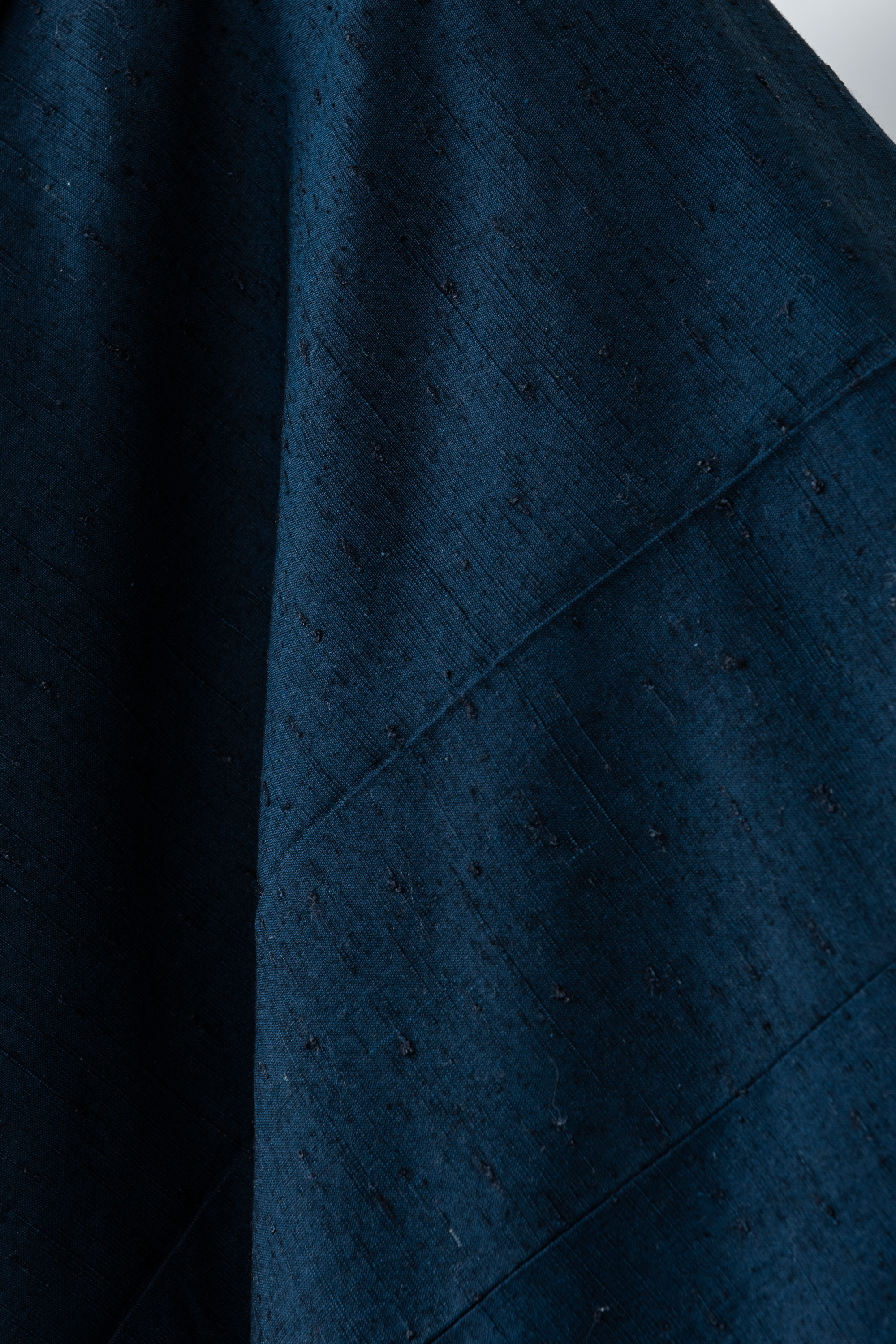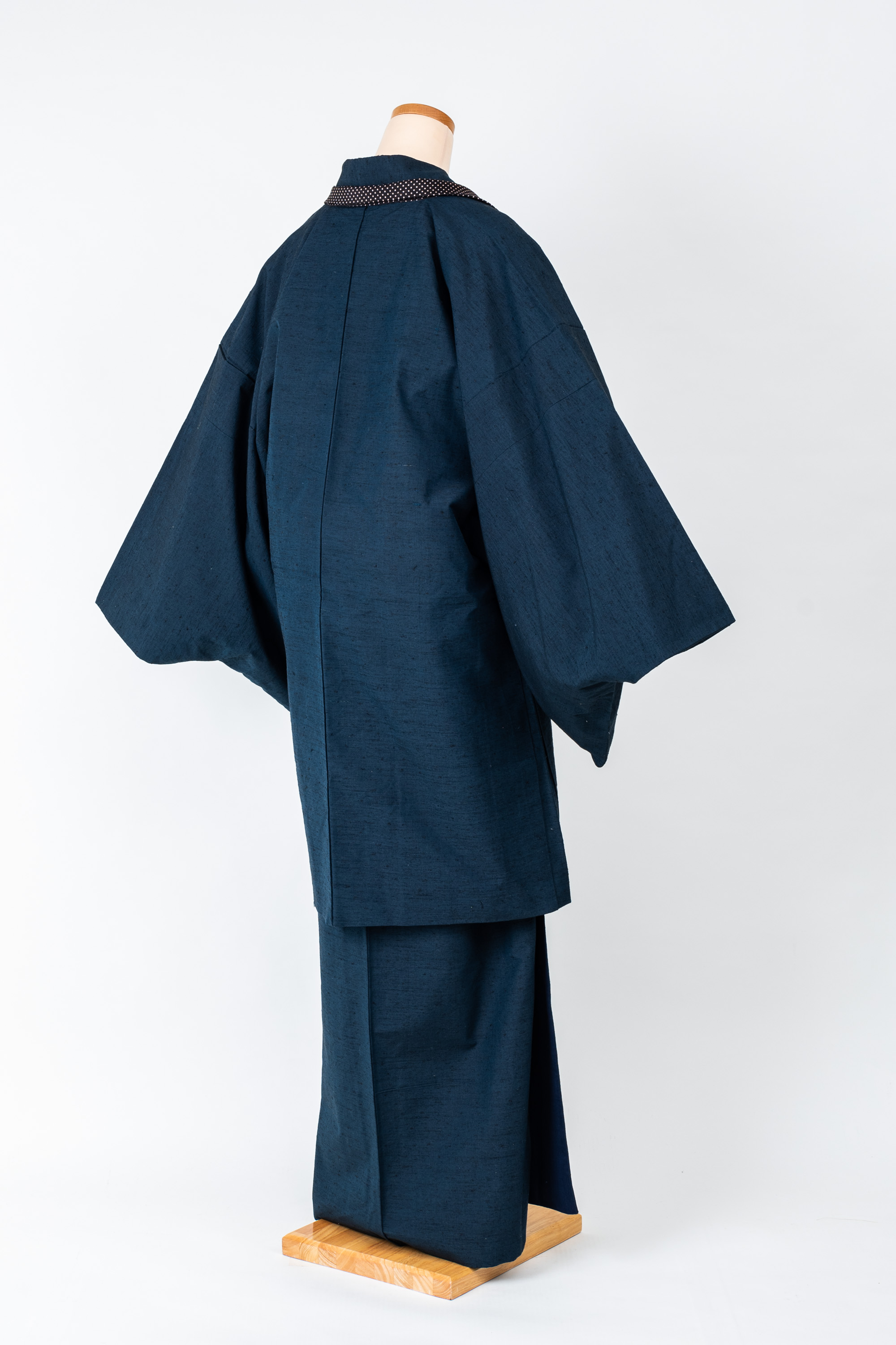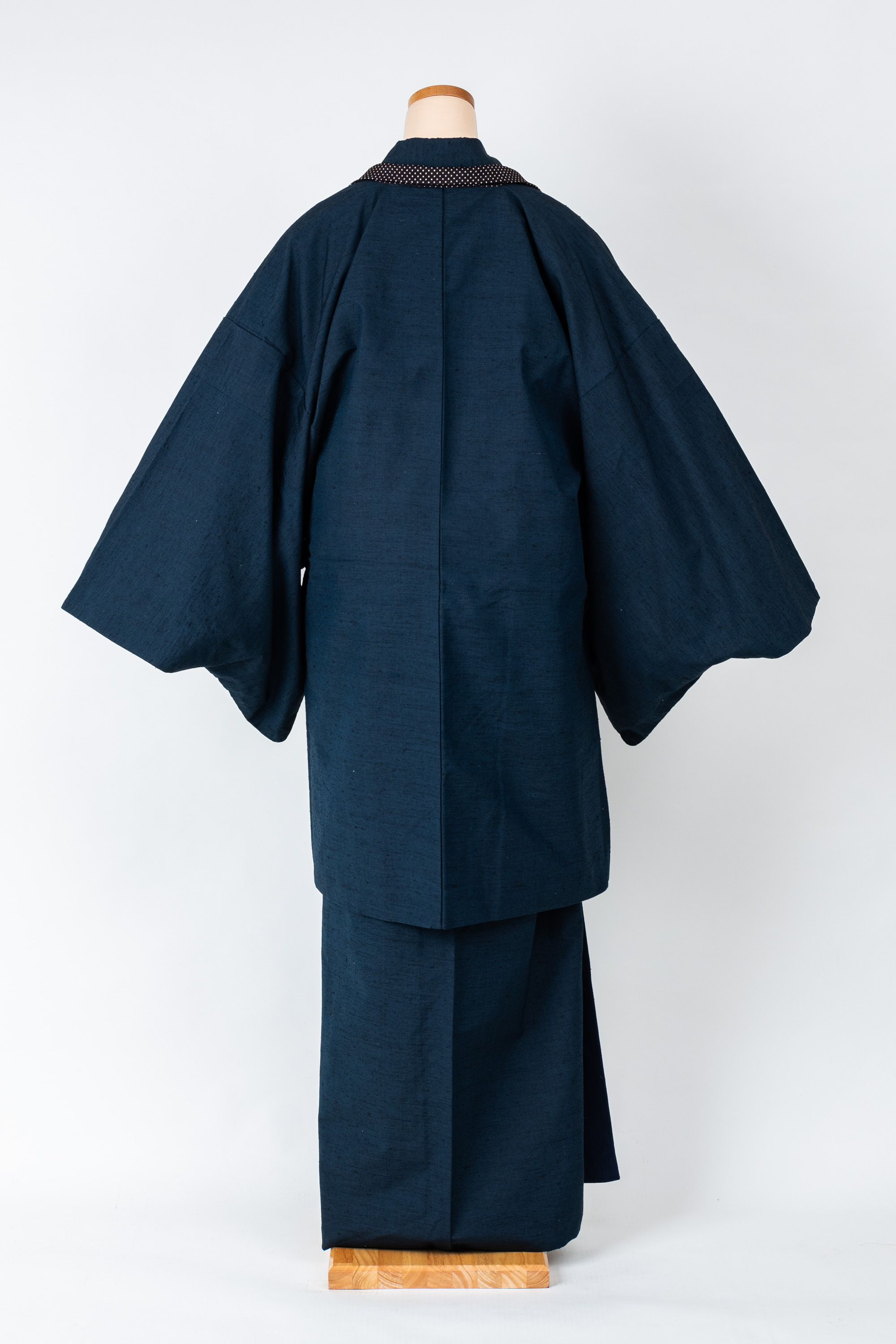 一見すると紺色に見えますが、ちょっとグリーンがかった色合いです。着物と羽織が共布の紬のアンサンブルで、生地はやや髭紬のように織られています。