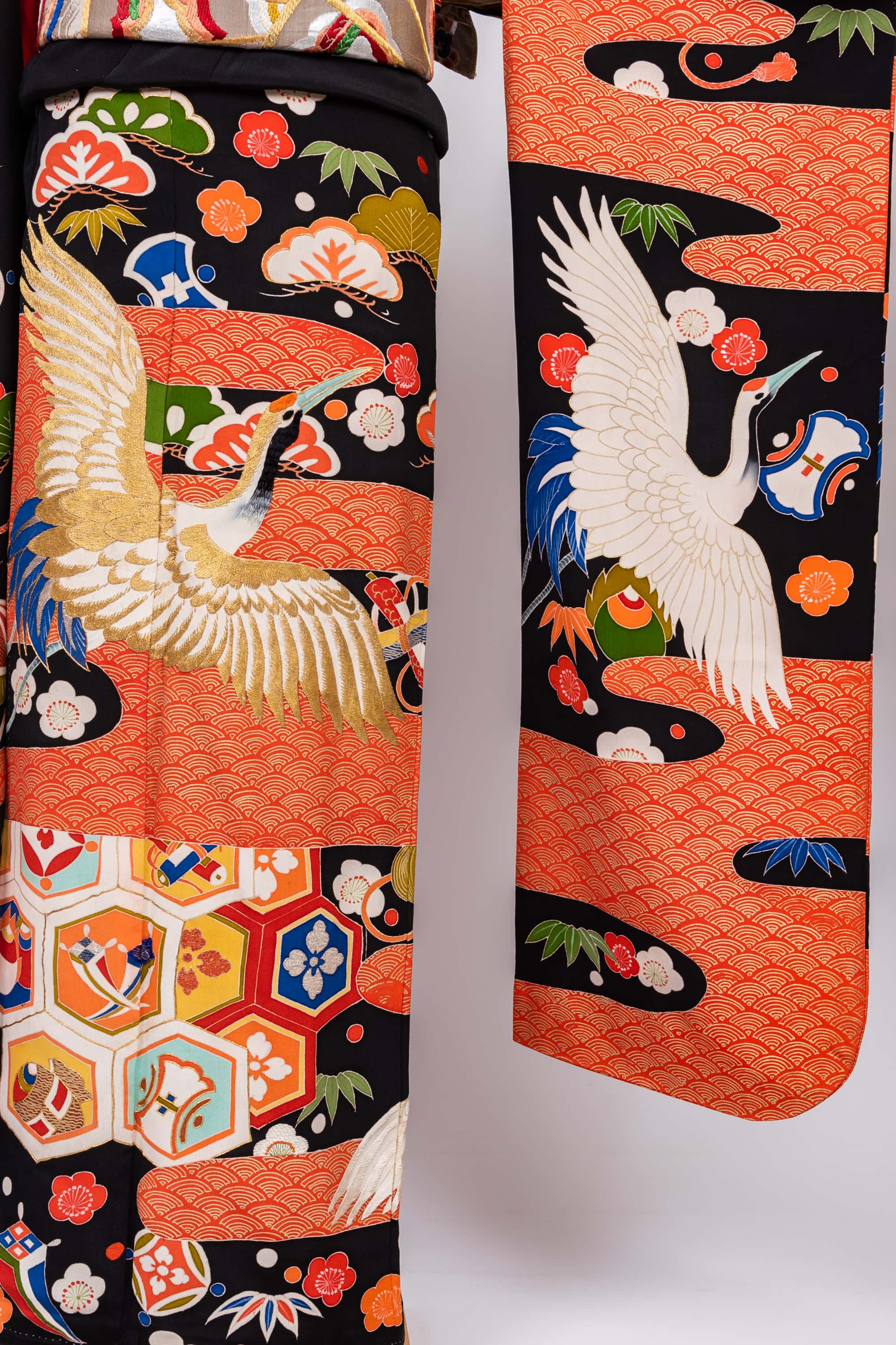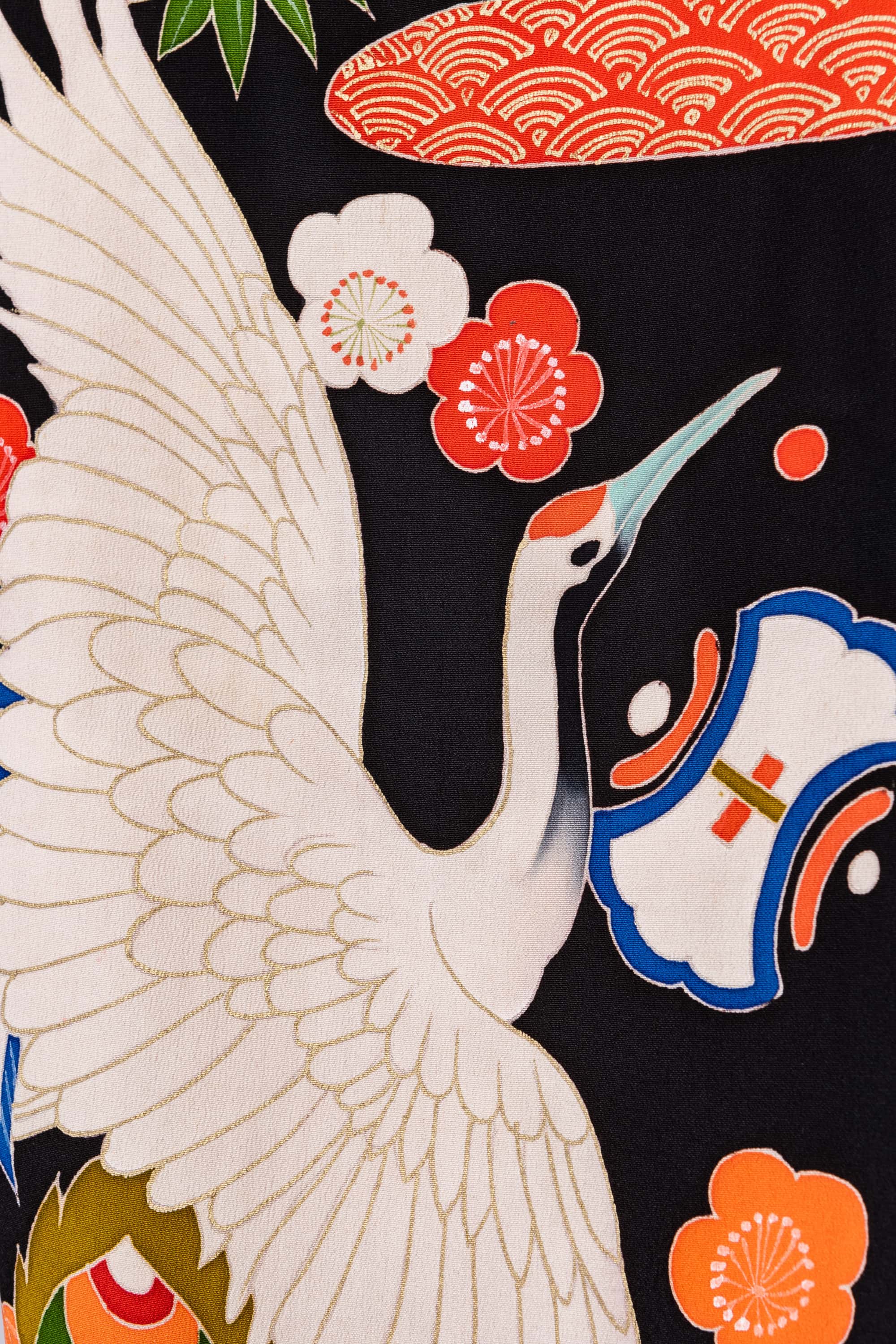 おめでたい尽くしの絵柄を背景に、たくさんの鶴が飛んでいます。左向きに衽に向かって飛ぶ姿を描かれることが多いのですが、この鶴は右向きです。どうしたことでしょうね。