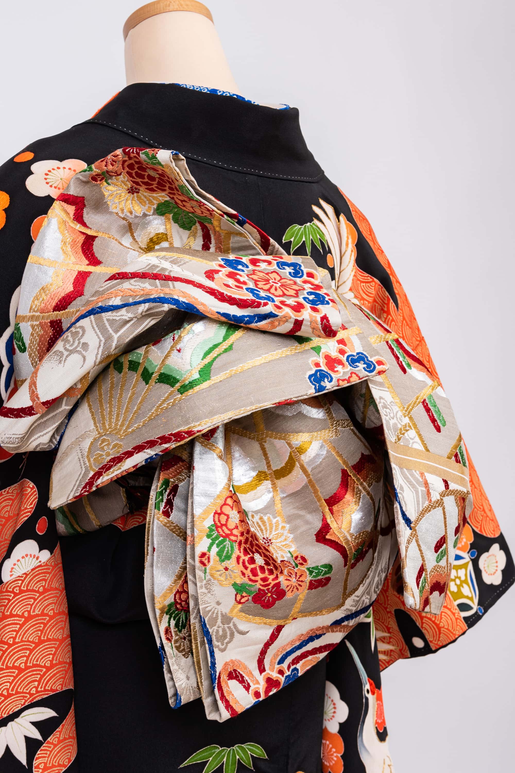 オレンジのヱ霞に宝尽くしが散りばめられ、鶴が群れ飛んでいる、五つ紋付アンティーク黒振袖です。手描き・手刺繍・金駒刺繍でたくさんの絵柄がほどこされています。後ろ姿の上の方までじゅうぶんな絵柄が入り、嬉しさが伝わってくる振袖です。裏は紅絹で仕立てられています。帯は銀色地に金縁で扇が描き出され、扇の中には花薬玉が踊っています。重ね衿と帯揚げは、左胸の松と同じブルーにしました。赤と黒の漆塗りに螺鈿の帯留も存在感があります。(※本商品は期間3泊4日のレンタル用着物です)