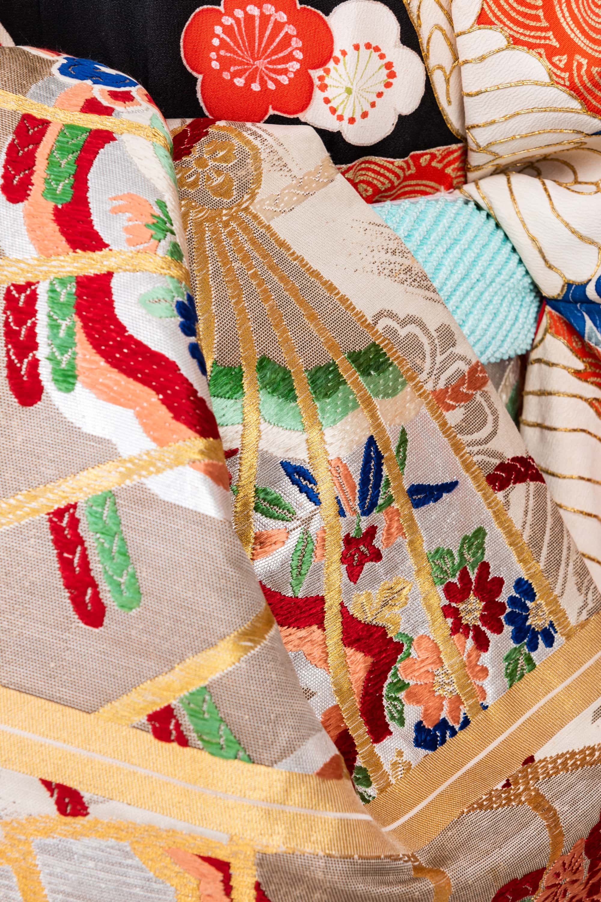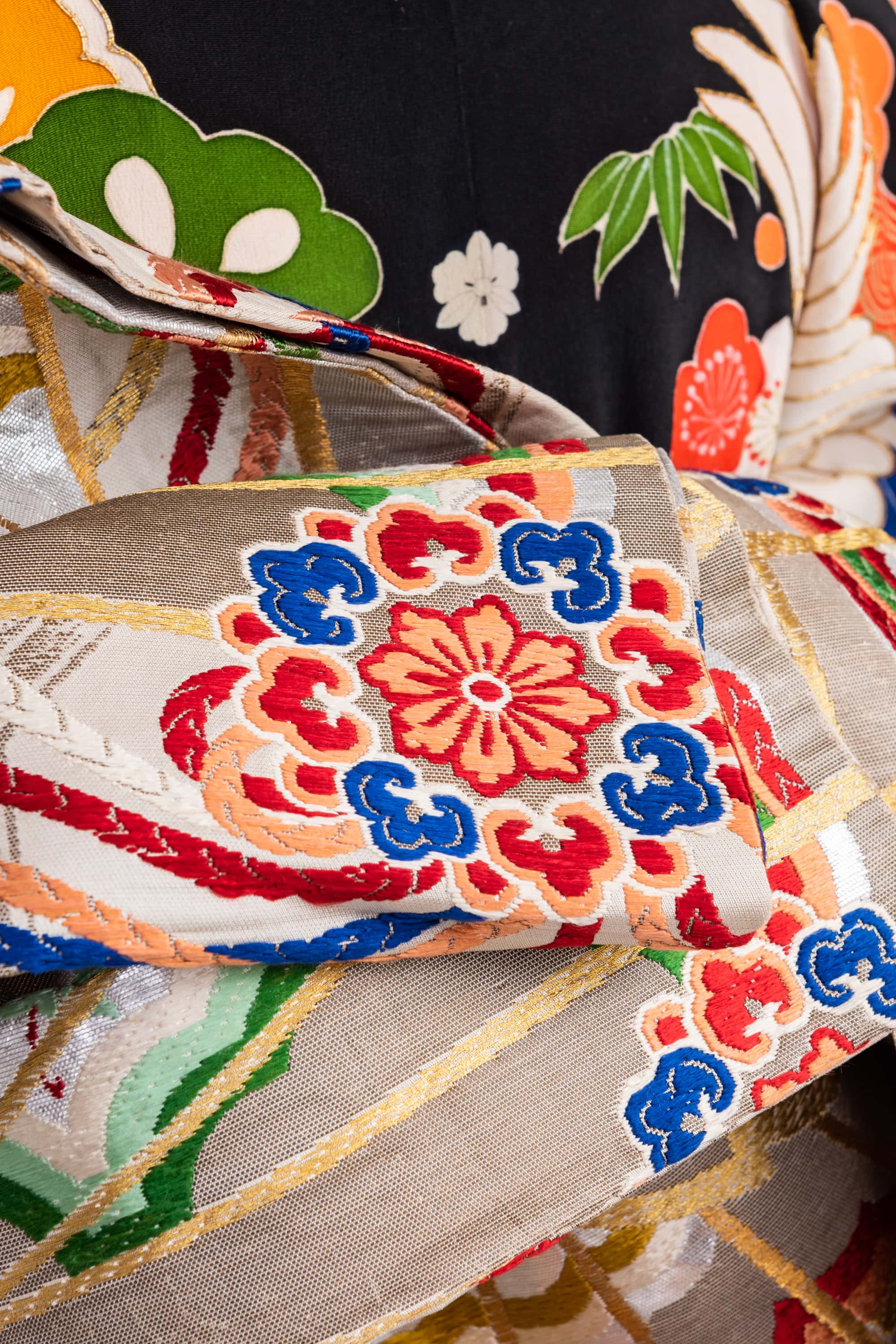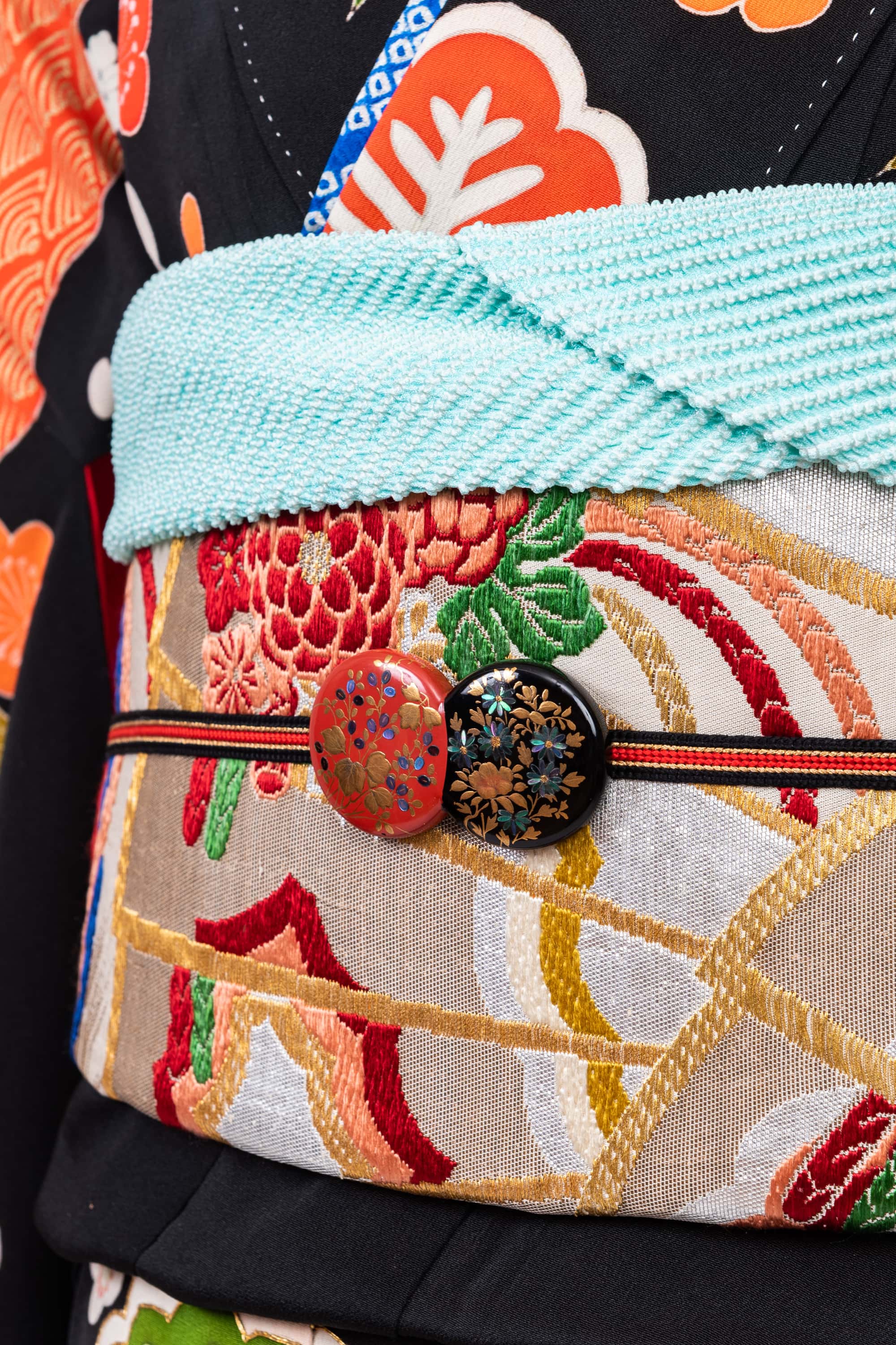 帯は、金の扇に花薬玉の丸帯です。華やかですね。帯揚げと重ね衿は、左胸の松の青からとりました。赤色中心の華やかななかで、ブルーや緑のポイントカラーが映えています。