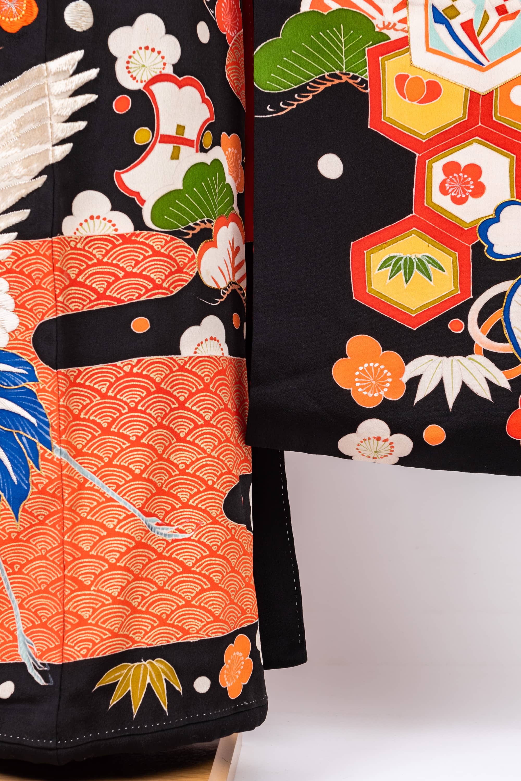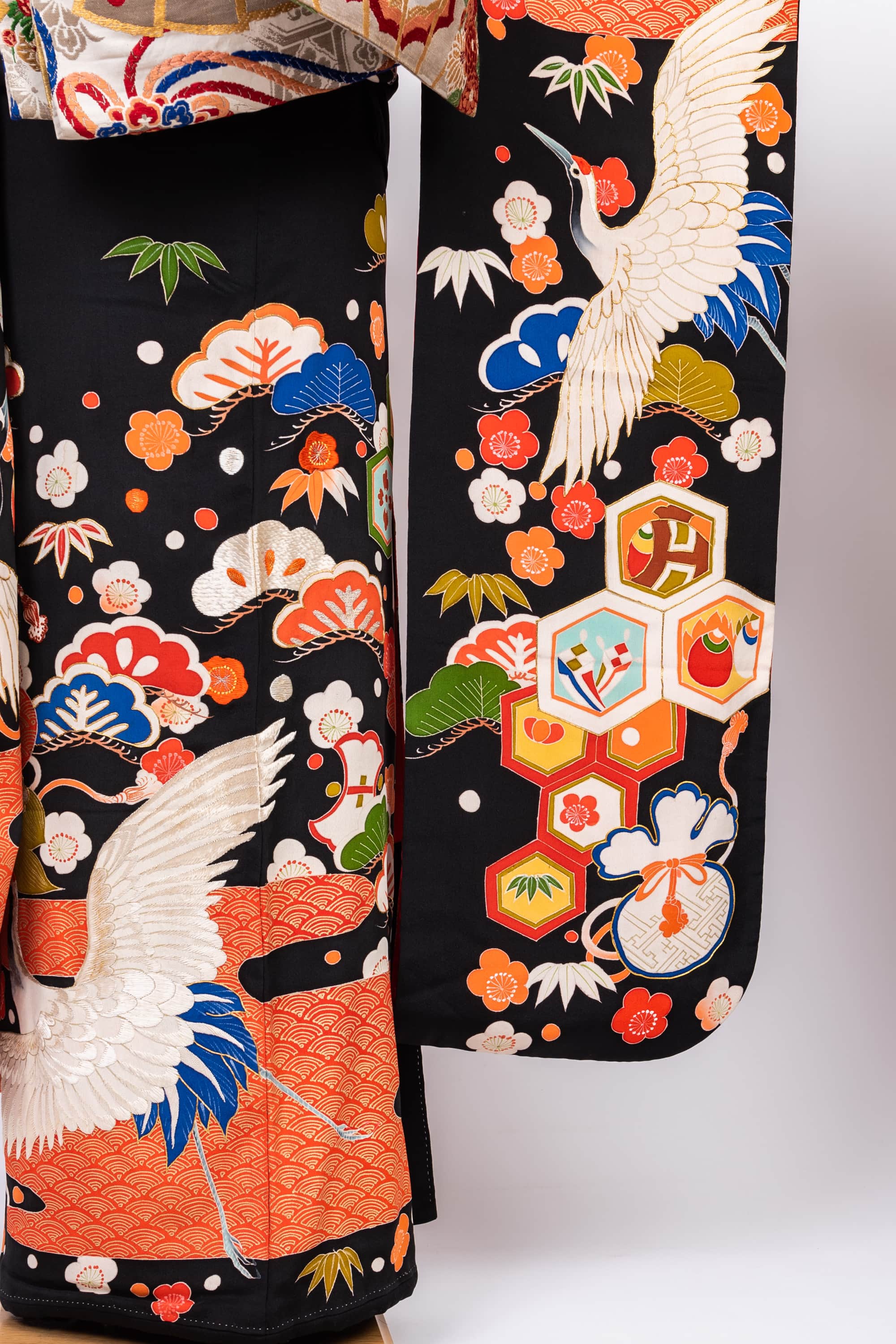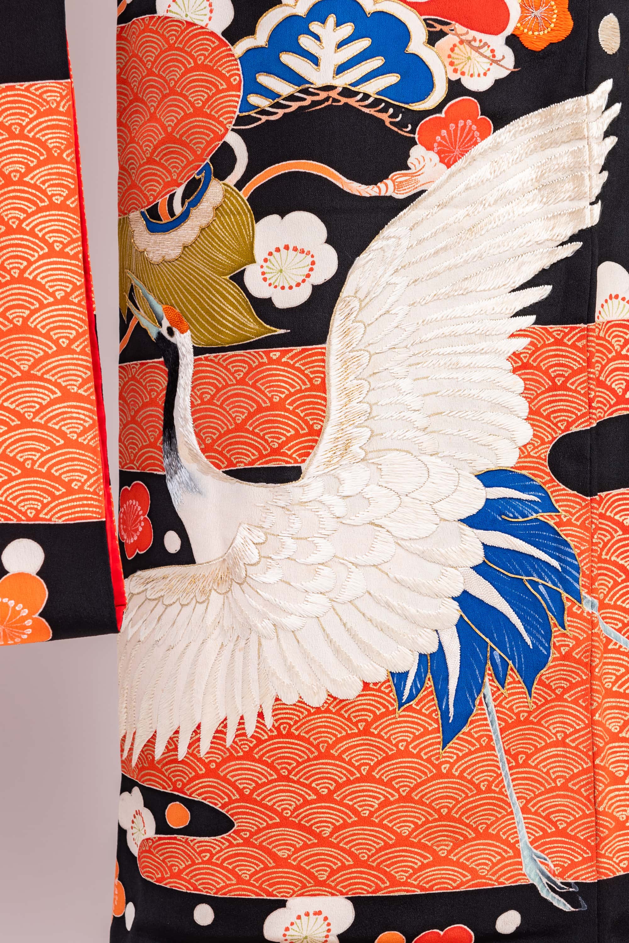 特に、右肩の松の存在感が圧倒的です。濃いオレンジ色の手刺繍と金駒刺繍で描かれています。たっぷりとした立派な松です。松は男性をあらわしますので、このお嫁さんは立派なお婿さんのところにお嫁入りしたのだろうなと嬉しくなります。