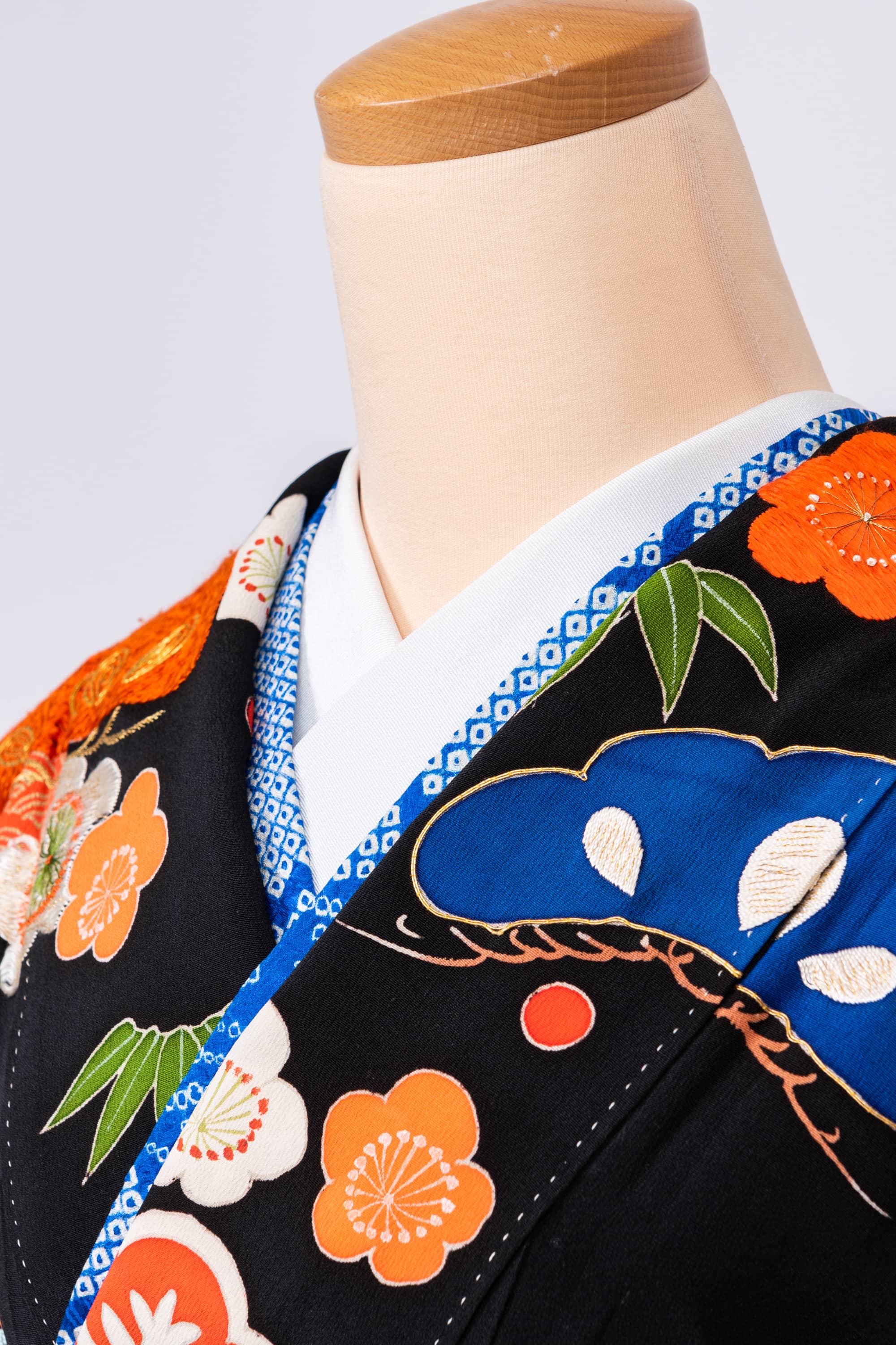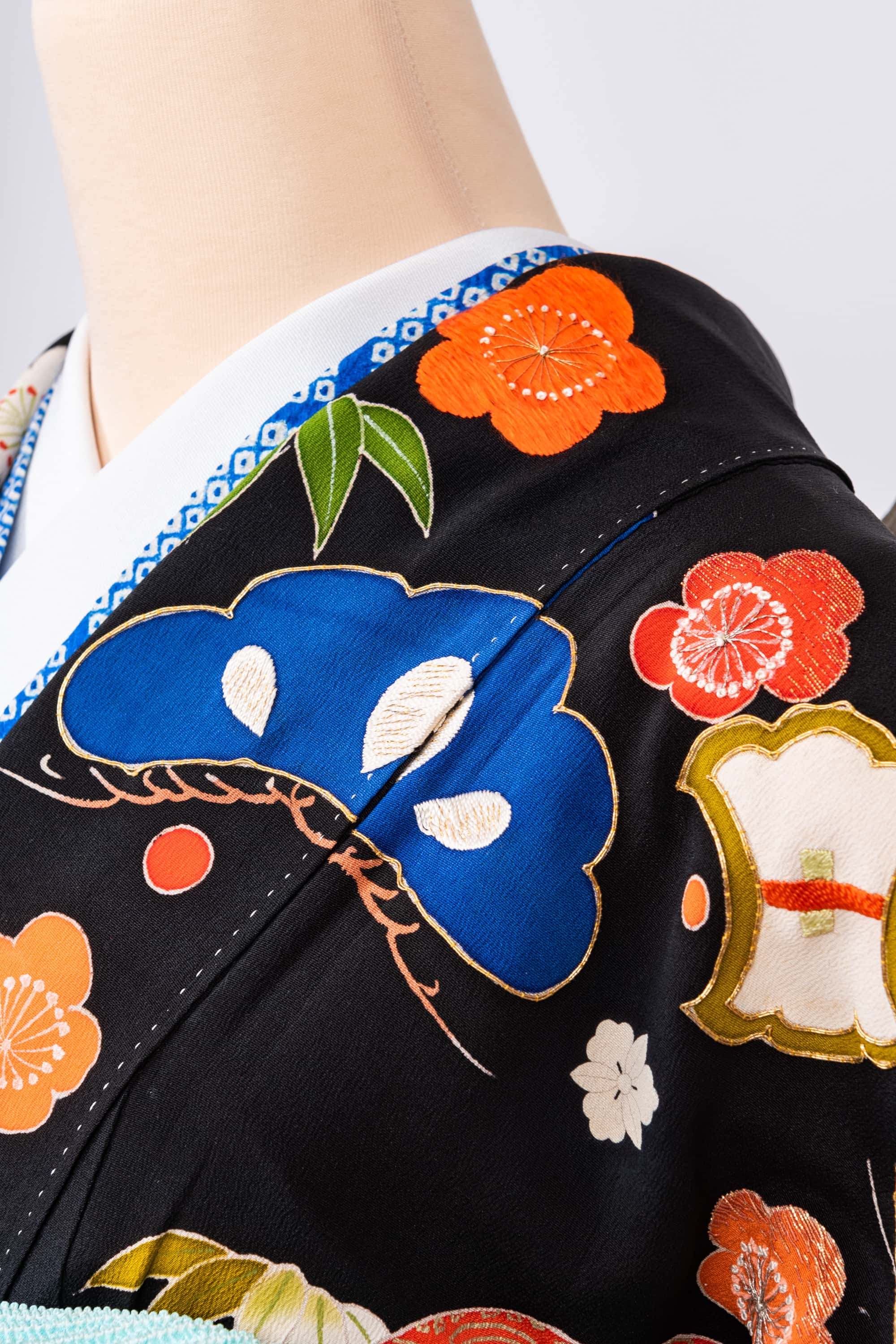 胸元が賑やかですよ。笹が緑で、松がブルーで、梅は紅白です。手刺繍もたくさんあります。梅の花の手刺繍がぼったりしてかわいらしいです。
